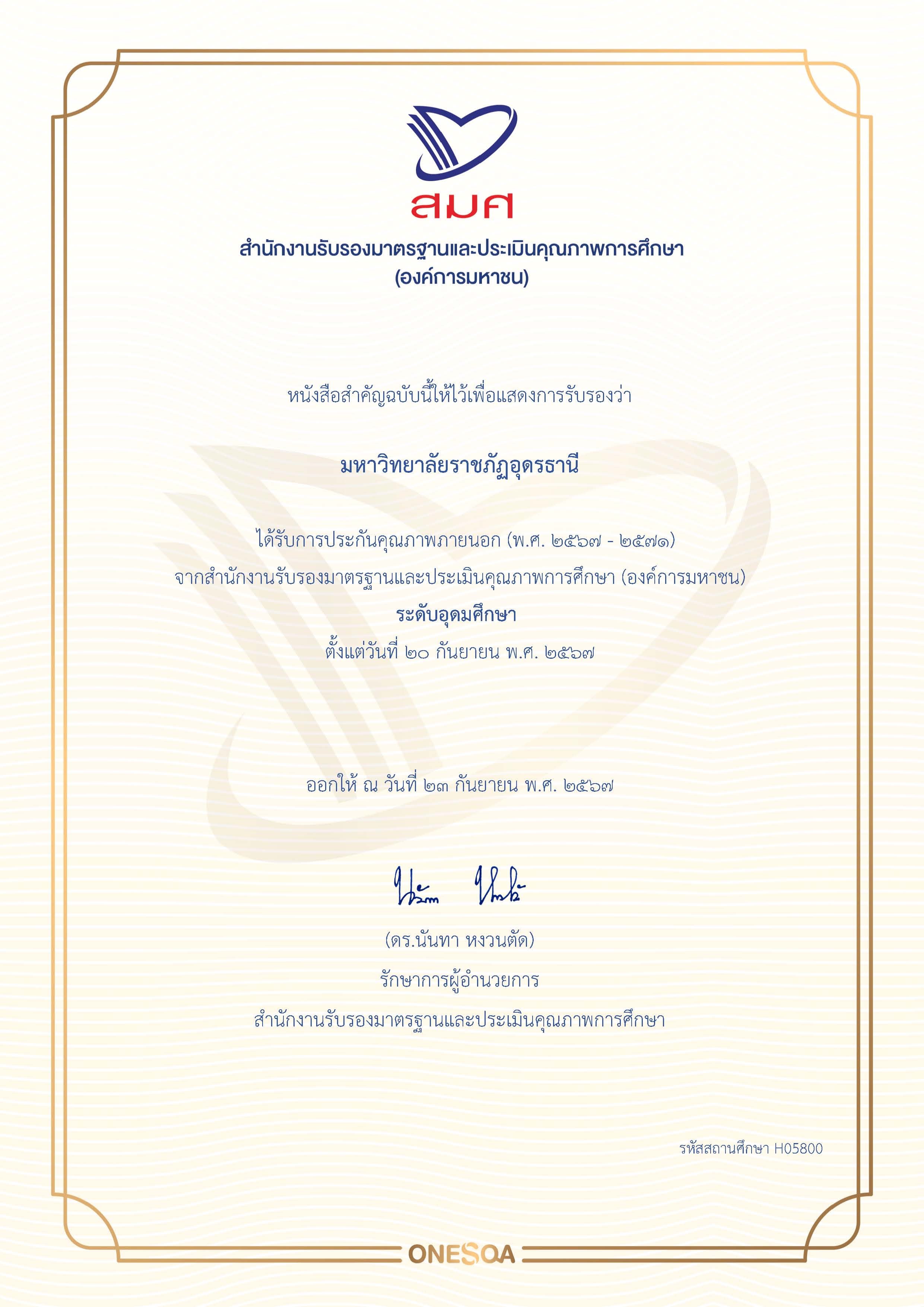 ซึ่งมีมติให้การรับรองผลการประเมินคุณภาพภายนอก ระดับอุดมศึกษา มหาวิทยาลัยราชภัฏอุดรธานี มีระยะเวลาการรับรองผลการประเมินคุณภาพภายนอก 5 ปี