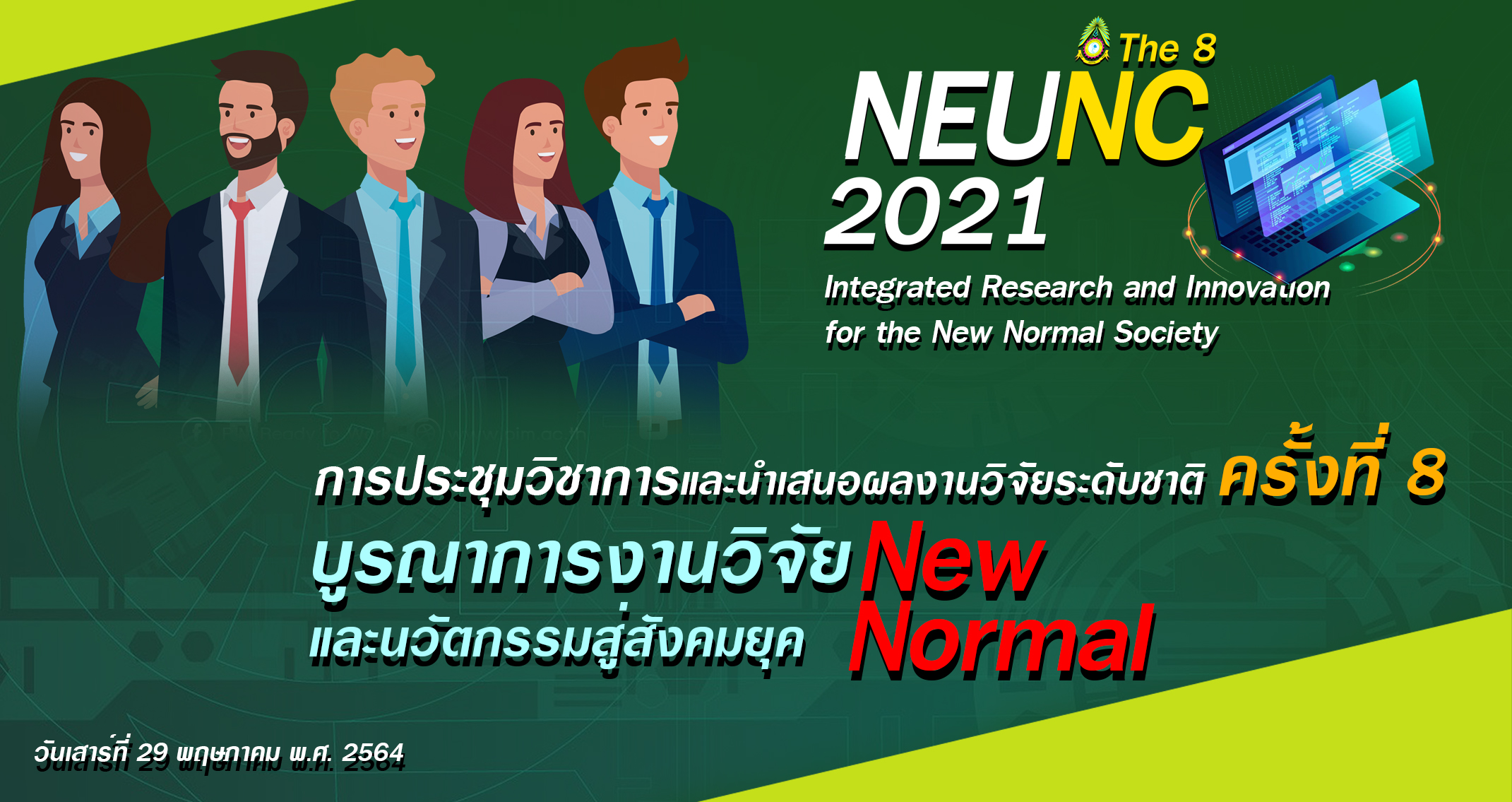 The 8th NEU National Conference 2021 (NEUNC2021) “Integrated Research and Innovation for the New Normal Society” การประชุมวิชาการและนำเสนอผลงานวิจัยระดับชาติ ครั้งที่ 8 เรื่อง บูรณาการงานวิจัยและนวัตกรรมสู่สังคมยุค New Normal ในวันเสาร์ที่ 29 พฤษภาคม พ.ศ. 2564 โดยใช้รูปแบบการประชุมวิชาการและนำเสนอผลงานวิจัยทางออนไลน์