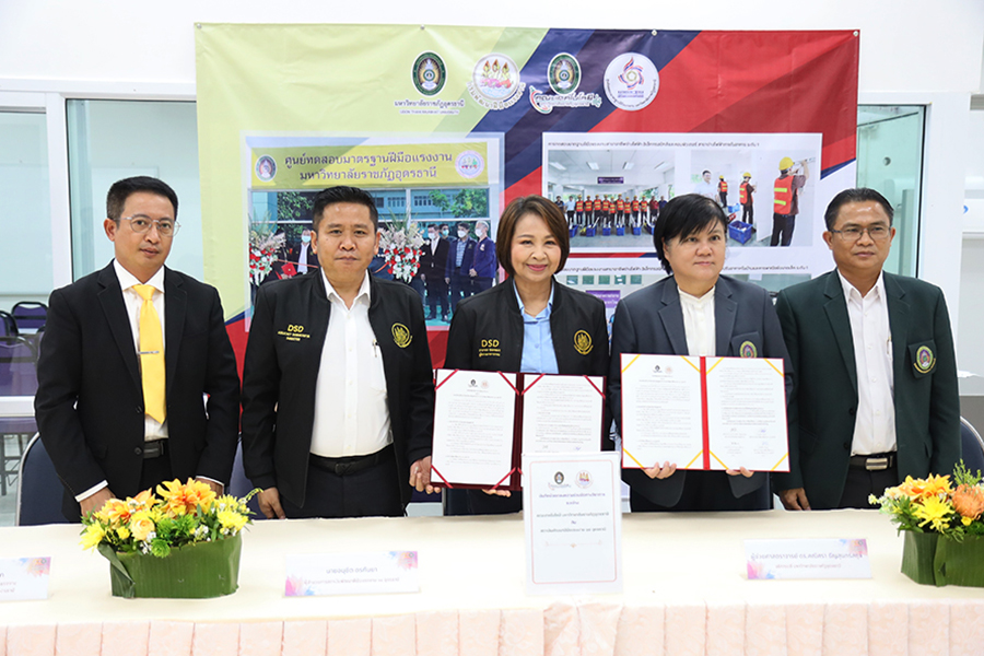 วันที่ 16 พฤศจิกายน 2566 ณ ศูนย์ทดสอบมาตรฐานฝีมือแรงงาน มหาวิทยาลัยราชภัฏอุดรธานี ผศ.ดร.คณิศรา ธัญสุนทรสกุล อธิการบดี กล่าวต้อนรับ นางสาวอาภากร ว่องเขตกร ผู้ตรวจราชการกรมพัฒนาฝีมือแรงงาน พร้อมด้วยคณะ ที่เข้าตรวจเยี่ยมศูนย์ทดสอบมาตรฐานฝีมือแรงงาน มหาวิทยาลัยราชภัฏอุดรธานี เพื่อยกระดับศักยภาพฝีมือแรงงาน จากนั้น รศ.ดร.สุนทร สุทธิบาก คณบดีคณะเทคโนโลยี นำเสนอผลการดำเนินงานของศูนย์ทดสอบ มาตรฐานฝีมือแรงงาน มหาวิทยาลัยราชภัฏอุดรธานี โดยความร่วมมือกับสถาบันพัฒนาฝีมือแรงงาน 18 อุดรธานี พร้อมทั้งลงนามความร่วมมือทางวิชาการระหว่างมหาวิทยาลัยราชภัฏอุดรธานี กับ สถาบันทดสอบมาตรฐานฝีมือแรงงาน และมอบป้าย ใบอนุญาตเป็นผู้ดำเนินการทดสอบมาตรฐานฝีมือแรงงาน โดยผู้ตรวจราชการกรมพัฒนาฝีมือแรงงาน ให้กับอธิการบดีมหาวิทยาลัยราชภัฏอุดรธานี