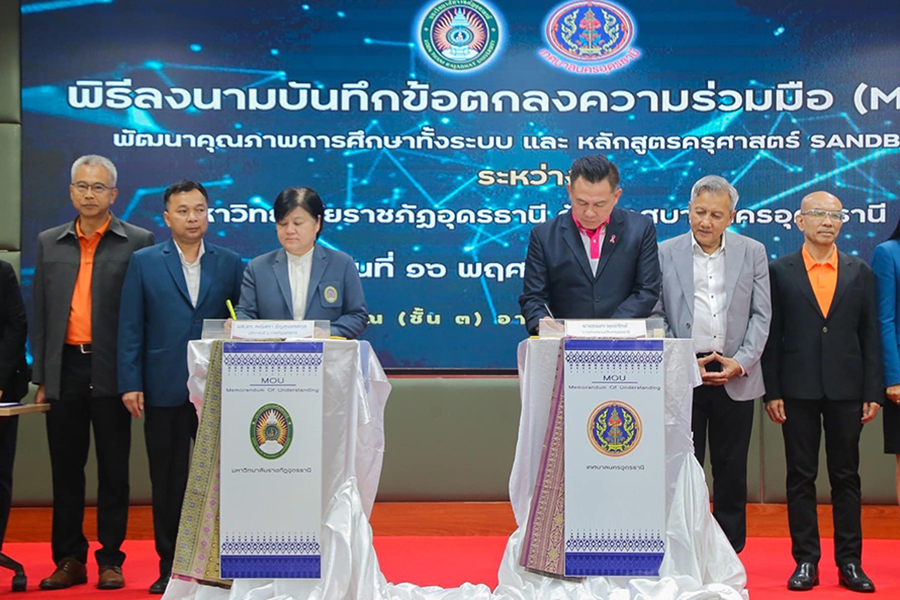 วันพฤหัสบดีที่ 16 พฤศจิกายน 2566 เวลา 16.00 น. ที่ห้องประชุมเวสสุวัณ ชั้น 3 อาคารเฉลิมพระเกียรติพัชรกิติยาภา สำนักงานเทศบาลนครอุดรธานี ผศ.ดร.คณิศรา ธัญสุนทรสกุล อธิการบดีมหาวิทยาลัยราชภัฏอุดรธานี ร่วมพิธีลงนามบันทึกข้อตกลงความร่วมมือ ระหว่าง มหาวิทยาลัยราชภัฏอุดรธานี กับ เทศบาลนครอุดรธานี โดยมี ดร.ธนาดร พุทธรักษ์ นายกเทศมนตรีนครอุดรธานี ร่วมลงนาม พัฒนาคุณภาพการศึกษาทั้งระบบ รวมทั้งการให้ความร่วมมือจัดทำโครงการครุศาสตร์ Sandbox เพื่อยกระดับการศึกษาของท้องถิ่นอย่างเป็นรูปธรรม