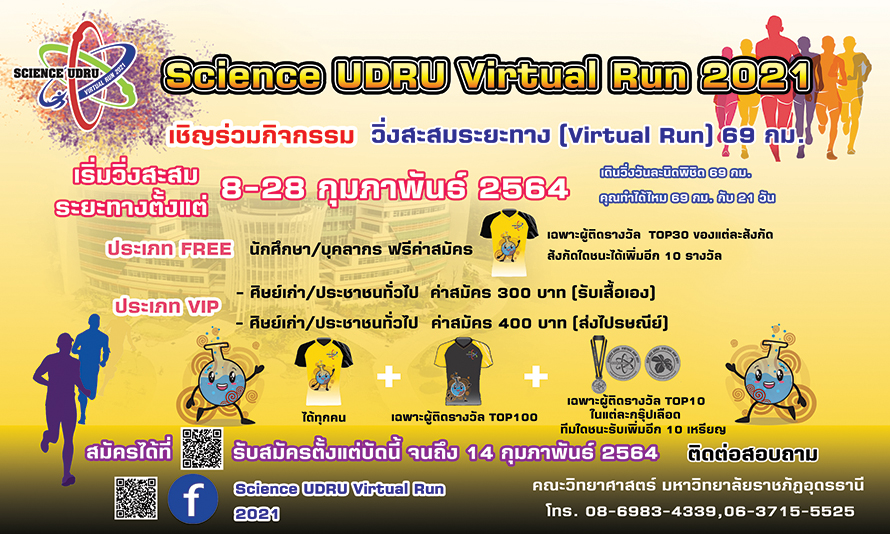 คณะวิทยาศาสตร์ได้จัดกิจกรรมเดินวิ่งสะสมระยะทาง “Science UDRU Virtual Run 2021” เพื่อเป็นการส่งเสริมให้นักศึกษา บุคลากรของมหาวิทยาลัยราชภัฏอุดรธานี และประชาชนทั่วไป ได้หันมาให้ความสนใจกับการออกกำลังกาย ซึ่งปัจจุบันเป็นการออกกำลังกายในรูปแบบใหม่ ในช่วงที่มีการแพร่ระบาดของไวรัสโคโรนา (Covid-19)
