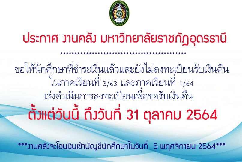 - ติดต่อรับเงินสดที่งานคลัง สำนักงานอธิการบดี มหาวิทยาลัยราชภัฏอุดรธานี บริเวณชั้น 1 อาคารเฉลิมพระเกียรติ ระหว่างเวลา 08.30 น. – 16.30 น. ในวันที่ 19 สิงหาคม 2564 วันที่ 26 สิงหาคม 2564 และวันที่ 9 กันยายน 2564
