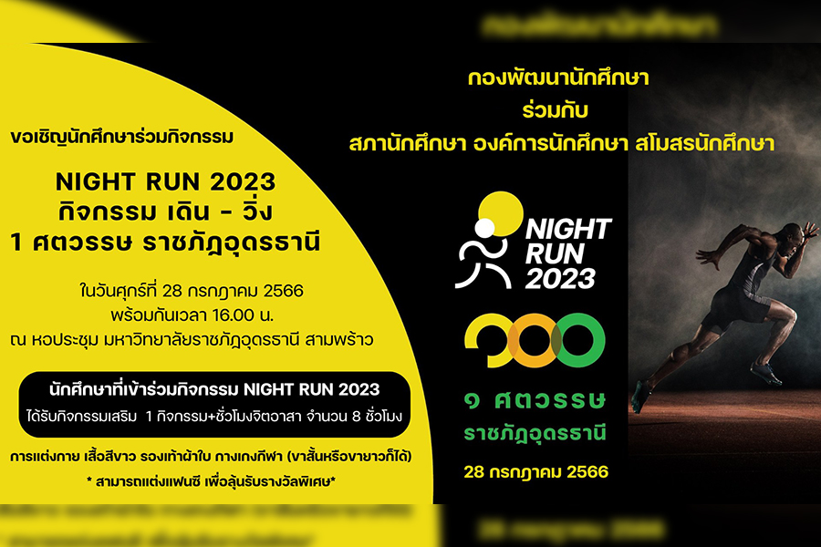 ขอเชิญชวนร่วมกิจกรรม UDRU Night Run 2023 ในวันที่ 28 กรกฎาคม 2566 ณ มหาวิทยาลัยราชภัฏอุดรธานี สามพร้าว เปิดระบบรับสมัคร วันที่ 15 มิถุนายน – 25 กรกฎาคม 2566 คลิก ? https://udrunightrun.com/2023/index.php