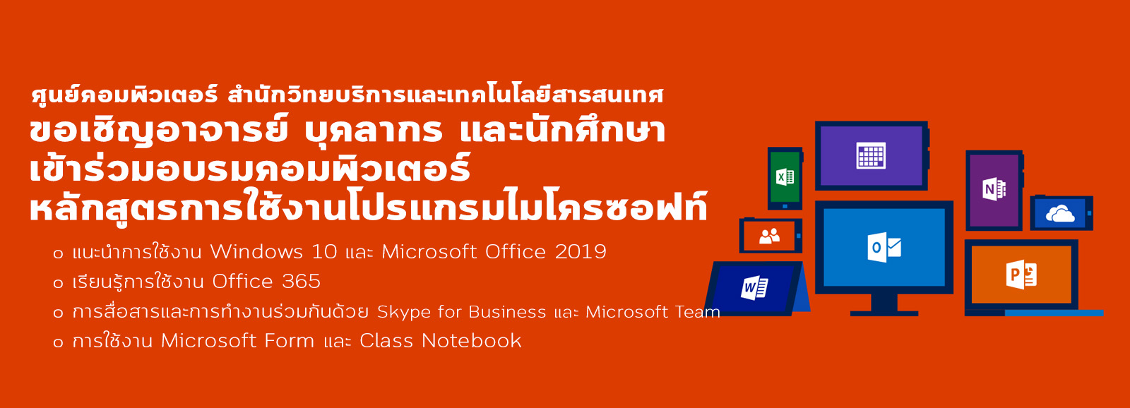 ศูนย์คอมพิวเตอร์ สำนักวิทยบริการและเทคโนโลยีสารสนเทศ ขอเชิญอาจารย์ บุคลากร และนักศึกษาเข้าร่วมอบรมคอมพิวเตอร์ หลักสูตรการใช้งานโปรแกรมไมโครซอฟท์
